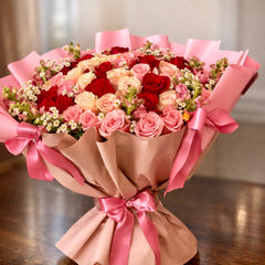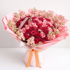 A luxurious arrangement of approximately 40 premium roses in red, blush, and cream tones, beautifully accented with fresh stock and delicate chamomile blooms. Wrapped in soft nude and pink finishes, this bouquet blends romance, texture, and elegance into one unforgettable floral statement.